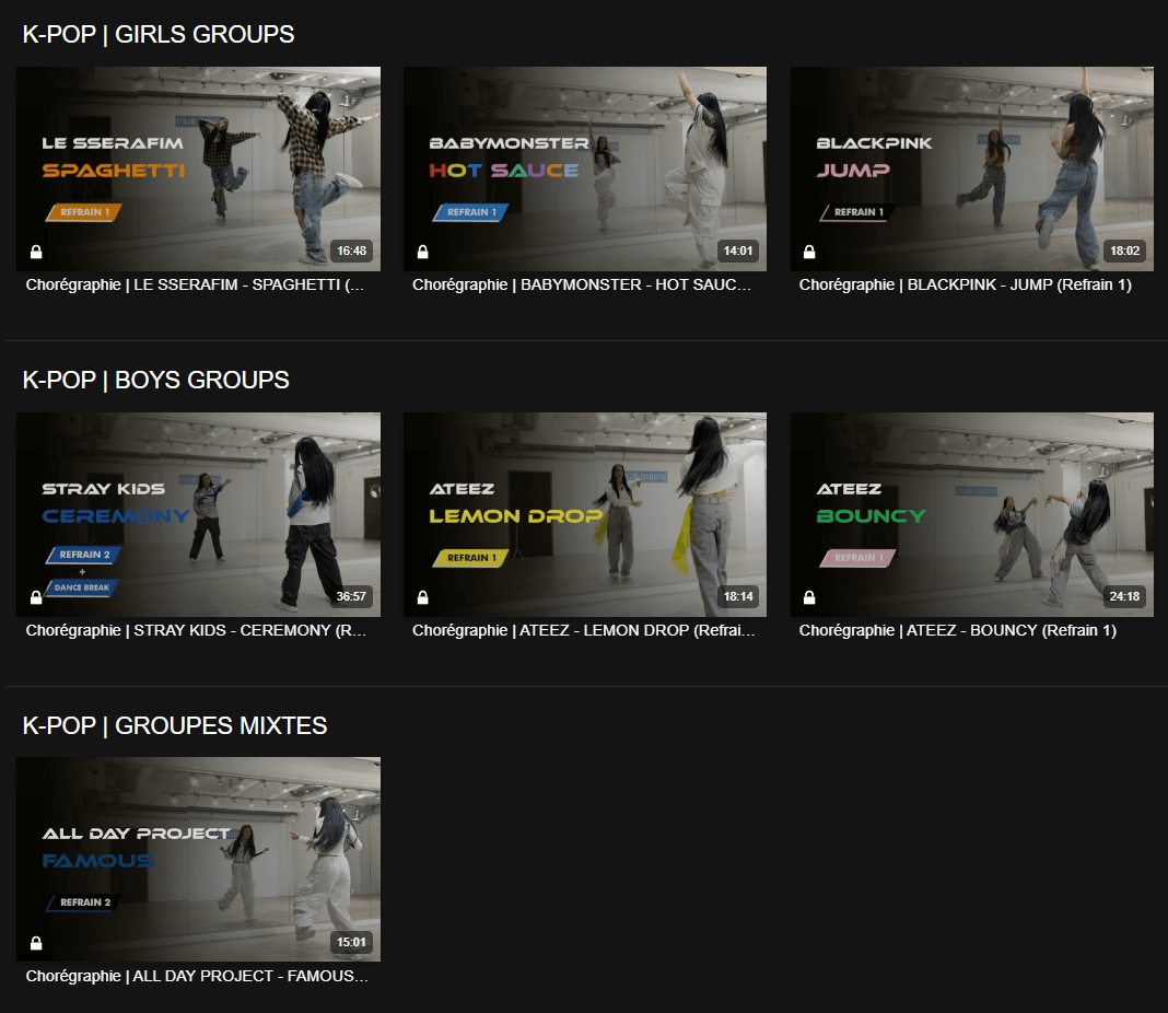 des chorégraphies de groupes comme Stray Kids, LE SSERAFIM, BLACKPINK, MEOVV, SEVENTEEN, ATEEZ, et bien d’autres.